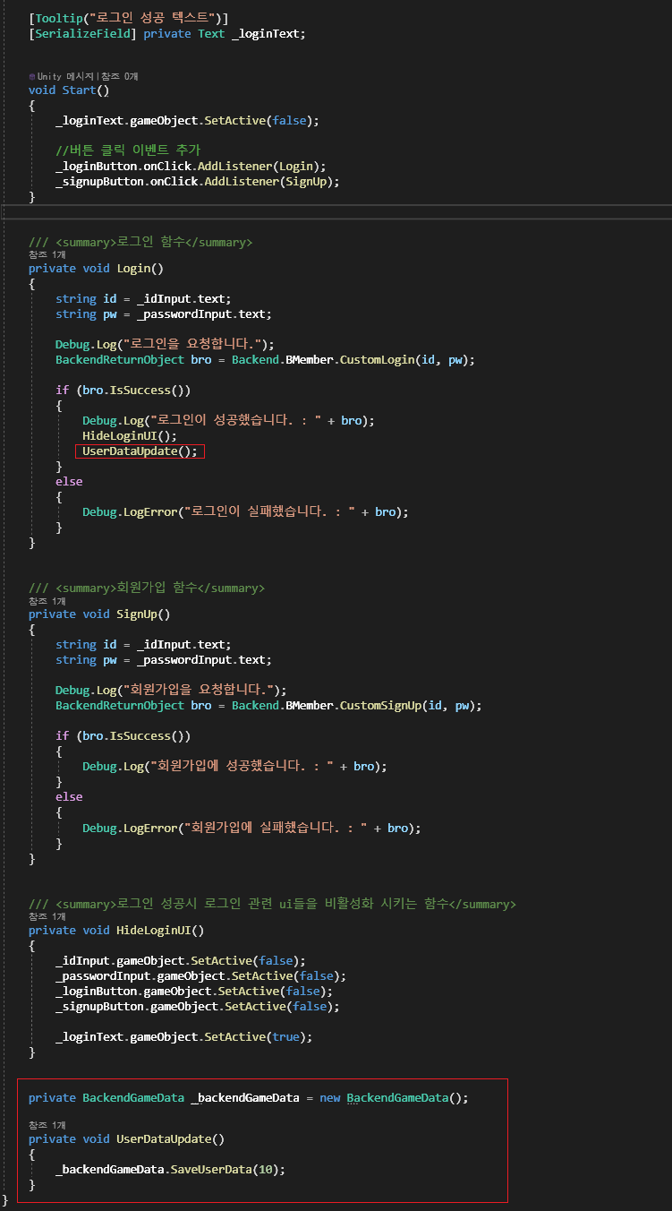 3. 이전에 작업했던 프로젝트를 켠 후, BackendManager.cs를 아래와 같이 수정합니다.