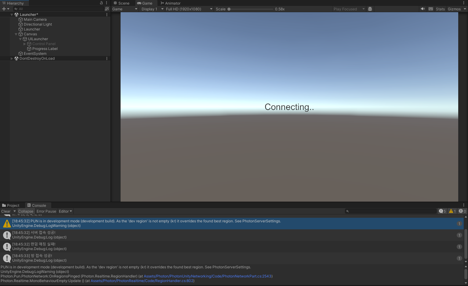다음으로 InputField와 Play Button을 감추고 간단한 문자열인 "Connecting..."으로 대체하고 필요시 다시 교체하도록 해보겠습니다.