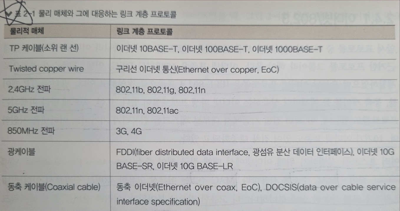 물리계층을 구현하고자 하는 물리적 연결 매체 마다 대응되는 하나 이상의 프로토콜이 링크 계층에 존재한다.